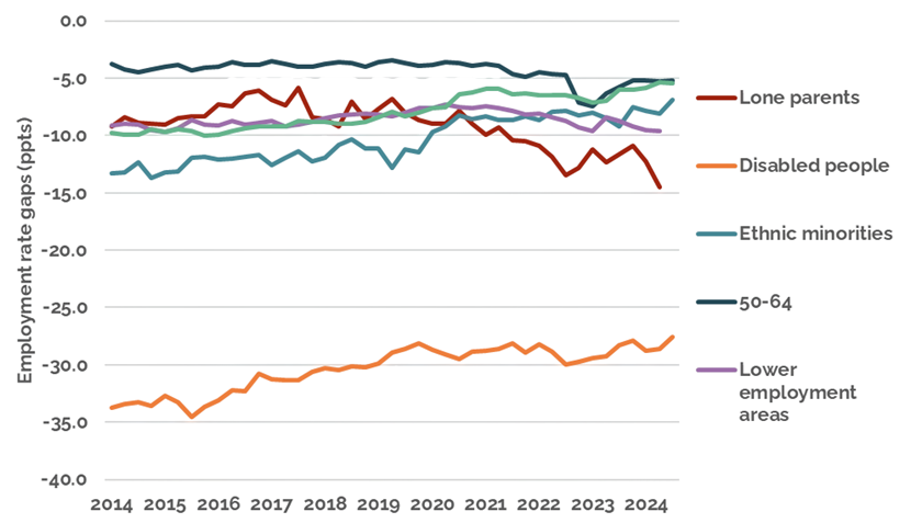 Large and persistent inequalities between groups and areas are holding back the overall employment rate (Figure 1). Closing the disability employment rate gap would mean an extra 2.4 million people in work, while closing the gap between the top 20% of local authorities with the lowest employment rates and the rest of the country would mean an extra 350,000 people in work.